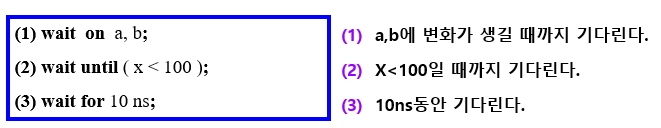 wait on signal[,signal] : Sensitivity List에 변화가 생기 때 까지 기다린다