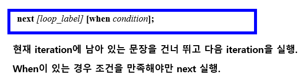 when의 조건을 만족하면 지금 돌고있는 iteration을 탈출하고 다음 iteration을 실행한다.