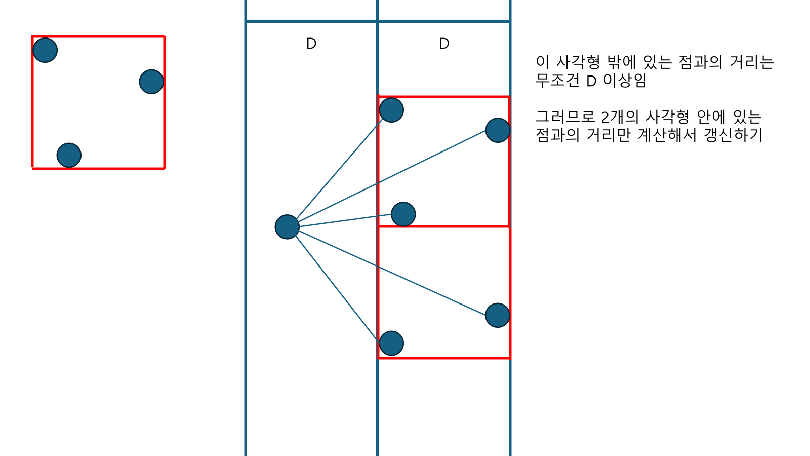 - 그 뒤 다른 모든 점과의 거리를 재서 가장 가까운 쌍을 찾음