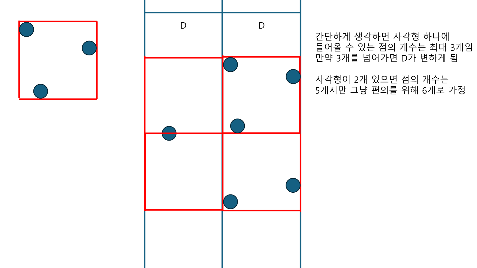 - 점과 Band를 기준으로 D의 길이를 가진 정사각형 4개를 그려보자. 그러면 하나의 정사각형에는 최대 3개의 점이 들어갈 수 있다.