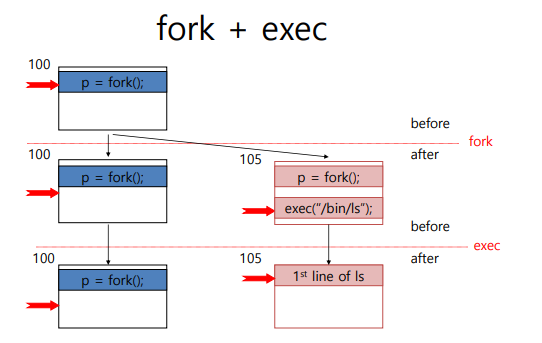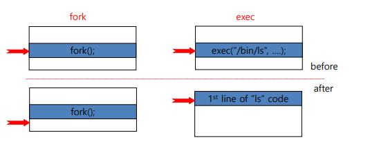 exec함수는 새로운 코드를 가져와서 실행시키는 함수를 말한다. 중요한 건 새로운 프로세스를 만드는 것이 아니라 새로운 코드를 가져와서 덮어쓰는 과정을 거친다는 말이다. 이를 통해서 기존 프로세스가 완전히 다른 프로세스로 변한다.