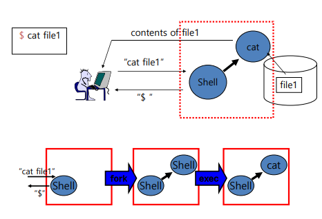다음은 쉘에서 cat 명령어를 사용하는 과정을 담은 사진이다. 쉘은 직접 수행하지 않고, fork를 통해 cat프로세스를 기다린다. 그동안 쉘은 wait하고 cat이 완료되면 결과물을 반환한다.