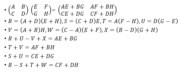 Strassen's Algorithm을 활용하면 변수를 7개로 줄일 수 있다.