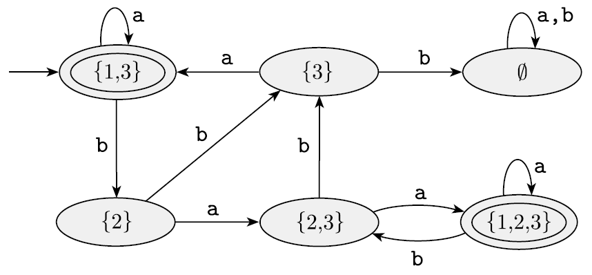 - Q' = P(Q)이다. M의 모든 상태는 N의 부분집합이며, P(Q)는 Q의 부분집합들의 합이다.