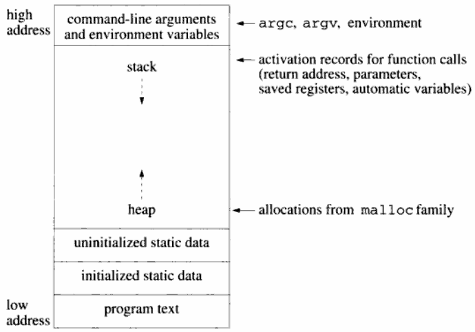 - command-line arguments and environment variables : argc, argv, 환경 변수 등을 저장한다. argc, argv는 main함수의 파라미터로 사용된다. 이것들은 main함수에 부가적인 설정을 하는 파라미터다. 환경 변수에는 프로그램에 대한 여러가지 정보가 들어있다.