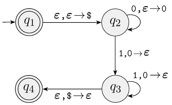 - q1−>q2 / ε,ε−>$, input : 000111, stack : $