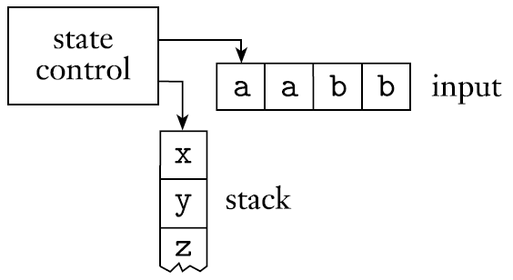 - pushdown automaton(PDA)는 symbol을 stack에 쓰고 읽을 수 있다. 다시 말해 push와 pop을 할 수 있다.