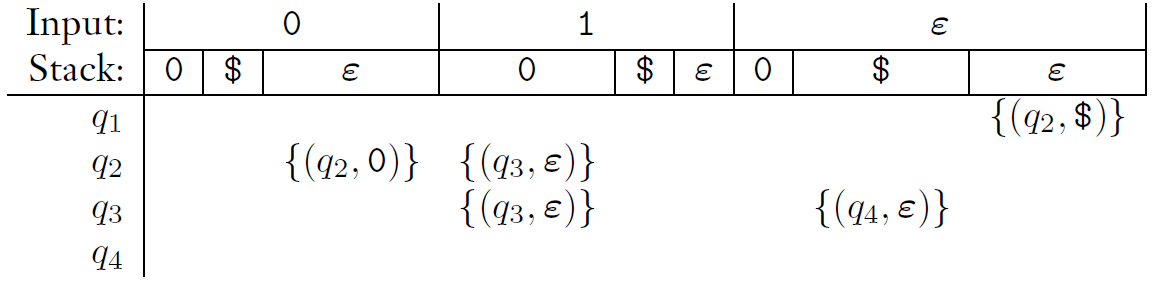 - q2 / 0,ε−>0, input : 011, stack : 00$