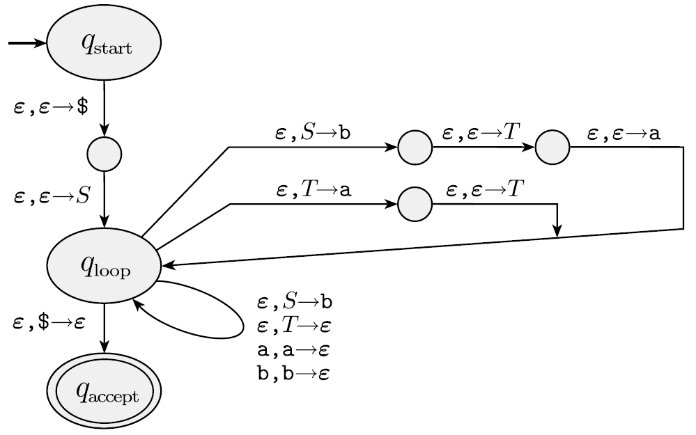 - 만약 stack top이 start variable S라면, S에 대한 규칙을 하나 골라서 S를 context-free grammer의 오른쪽에 해당하는 값으로 바꾼다.