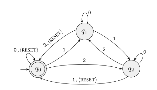 - M4 = ({<RESET>q0, q1, q2}, {0, 1, 2}, δ, q0, {q0})