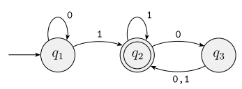 5-tuple(Q,Σ,δ,q0,F)로 구성된 유한 오토마톤(finite automation)는 다음과 같다.
