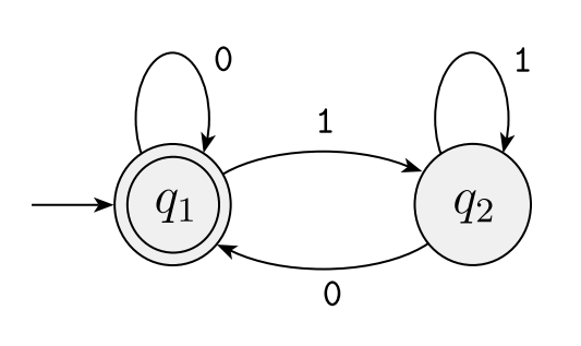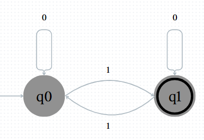 - 예를 들어 011100이 들어오면, 상태는 q0(starting) -> q0 -> q1 -> q0 -> q1 -> q1 -> q1(end)가 되며, q1은 accept state이므로 011100에 대한 이 유한 오토마타의 결론은 Accept가 된다.
