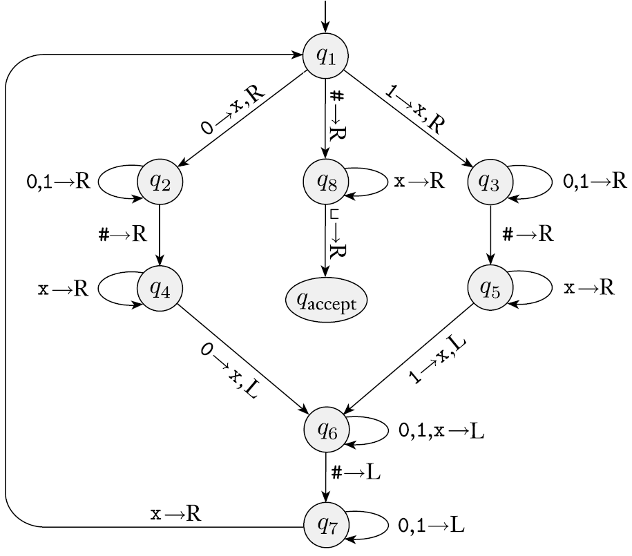 튜링 머신은 7-tuple 이며, 은 유한한 집합이다.