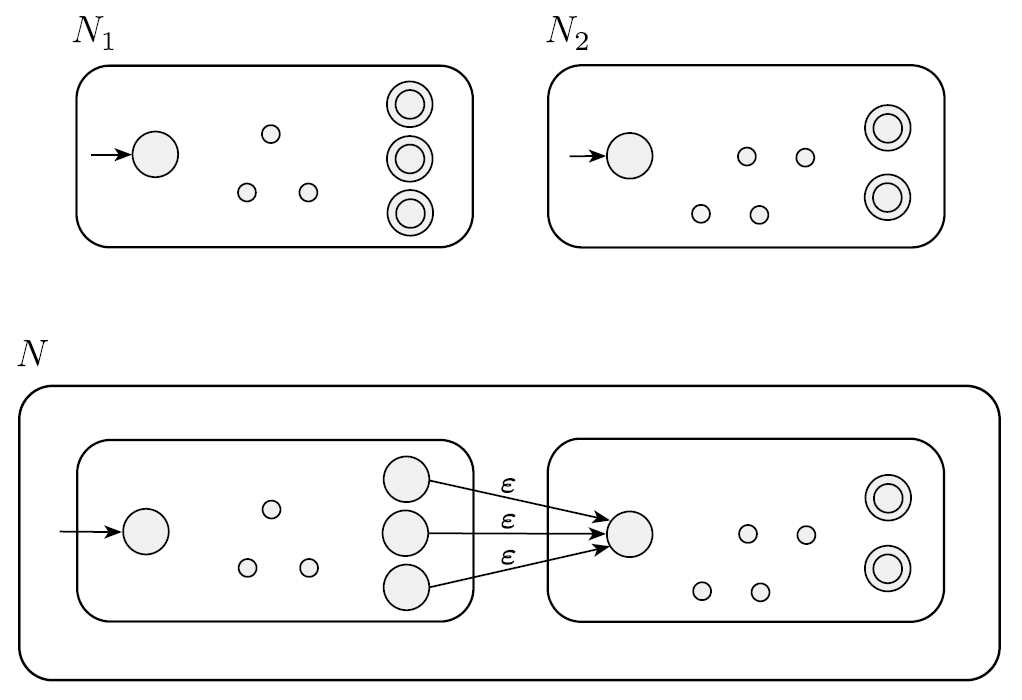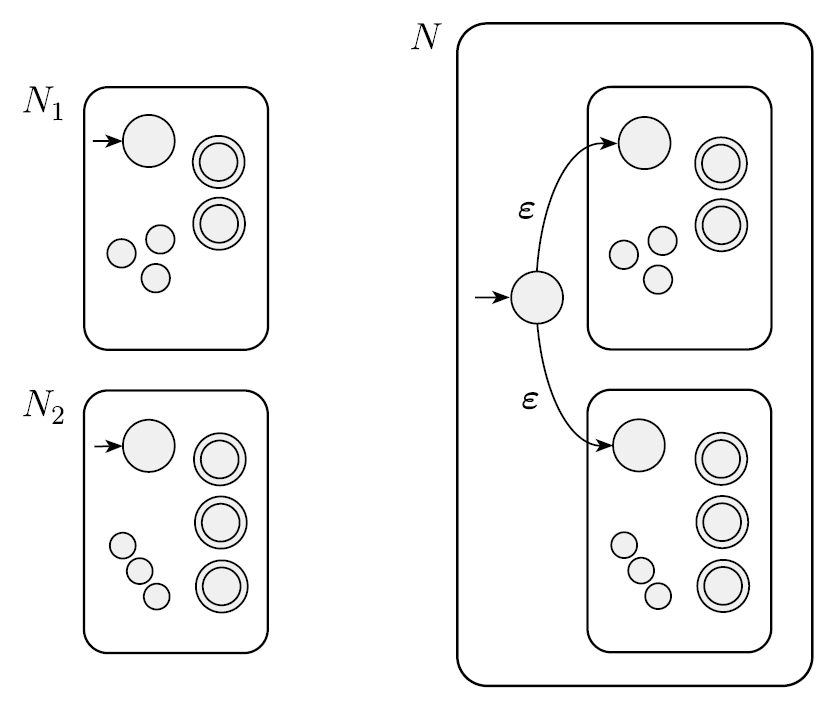 N은 N1과 N2를 가지고 있으며, 새로운 시작 지점에서 ε을 통해 각각에 접근한다. 새로 만들어진 N은 N1과 N2를 accept한다.