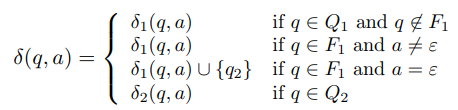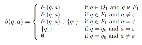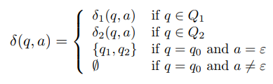 - Q = {q0} ∪ Q1 ∪ Q2. N1과 N2의 상태들을 가지고 있으며, 새로운 시작지점 q0를 가진다,