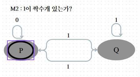M2는 0의 개수가 짝수인 language를 recognize하는 오토마톤이다.