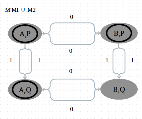F는 M1의 accept state거나 M2의 accept state여야 한다.우리는 F = {(r1, r2) | r1 ∈ F1 또는 r2 ∈ F2}처럼 쓸 수 있다.