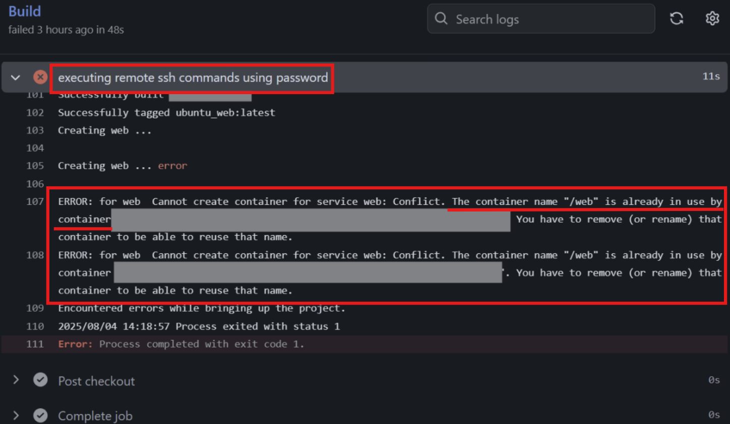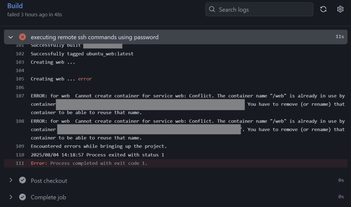 아래 ERROR: 부분을 보면 docker 컨테이너 생성 중에 같은 이름의 컨테이너가 이미 있어서 충돌이 발생하고 있다.