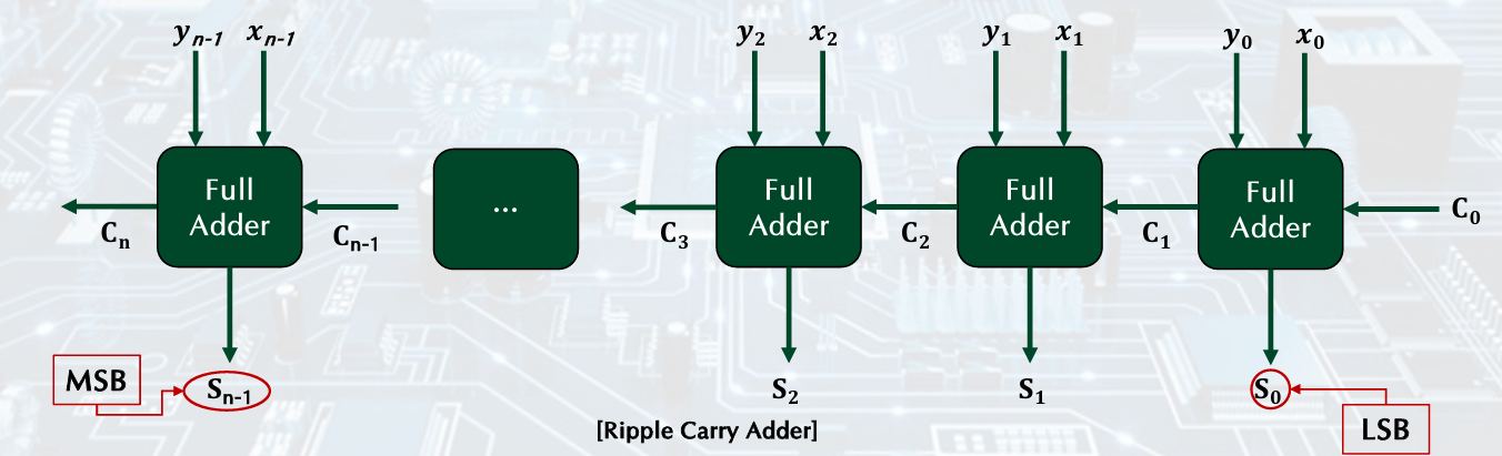 Simply connecting full adders. Previously calculated carry value is propagated to the next full adder.