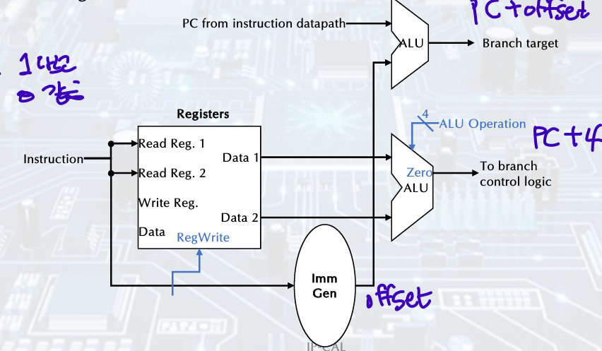 3. The ALU subtracts one data value from the register file. The value of PC is added to the sign-extended, 12 bits of the instruction (offset) left shifted by one; the result is the branch target address.