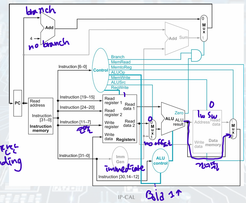 4. The Zero status information from the ALU is used to decide which adder result to store in the PC.