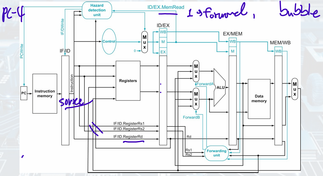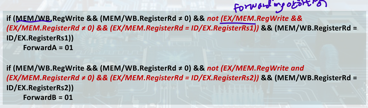 if (ID/EX.MemRead && ID/EX.RegisterRd ≠ 0 &&((ID/EX.RegisterRd = IF/ID.RegisterRs1) || (ID/EX.RegisterRd = IF/ID.RegisterRs2)))