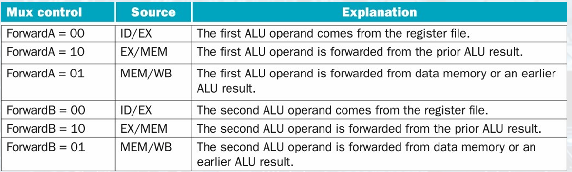 If the previous instruction is going to write to the register file and the write register number matches the read register number of ALU inputs A or B, the multiplexor picks the value from the EX/MEM.