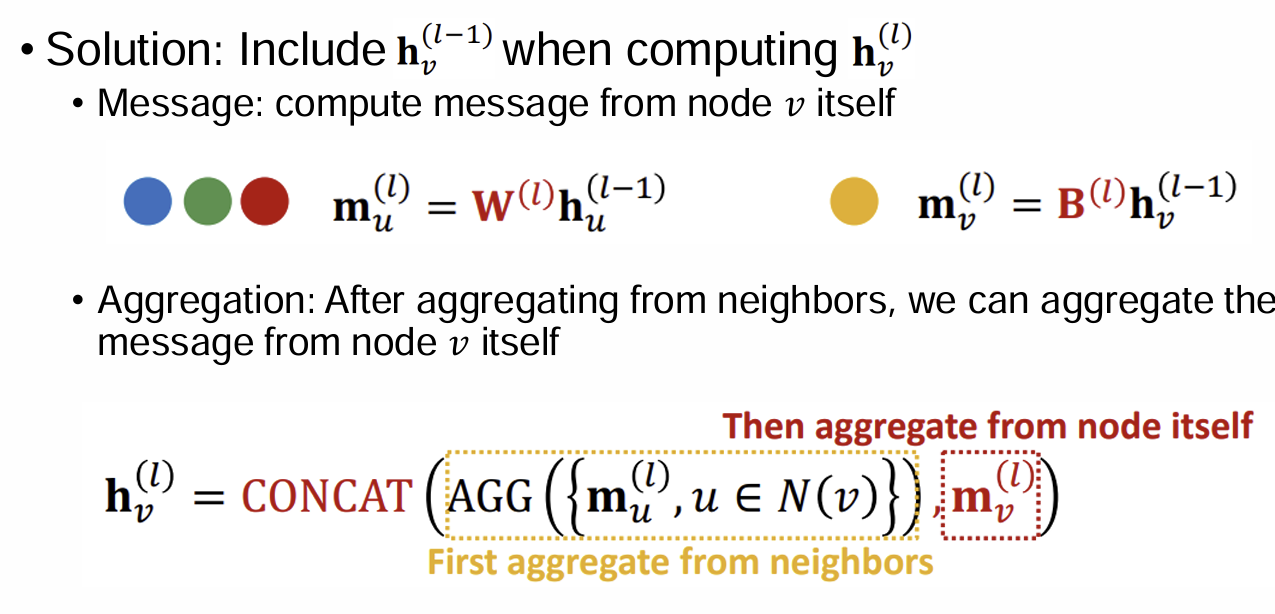 Aggregation: After aggregating from neighbors, we can aggregate the message from node 𝑣 itself