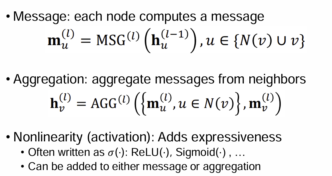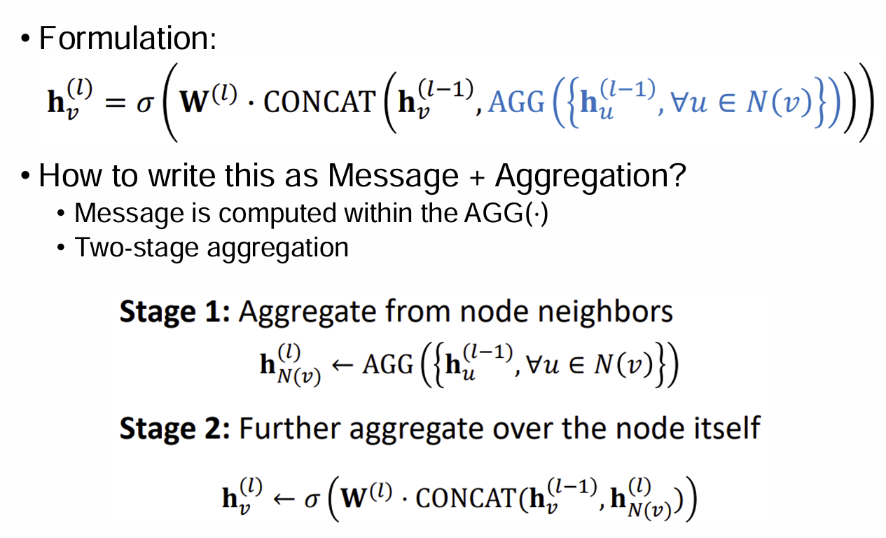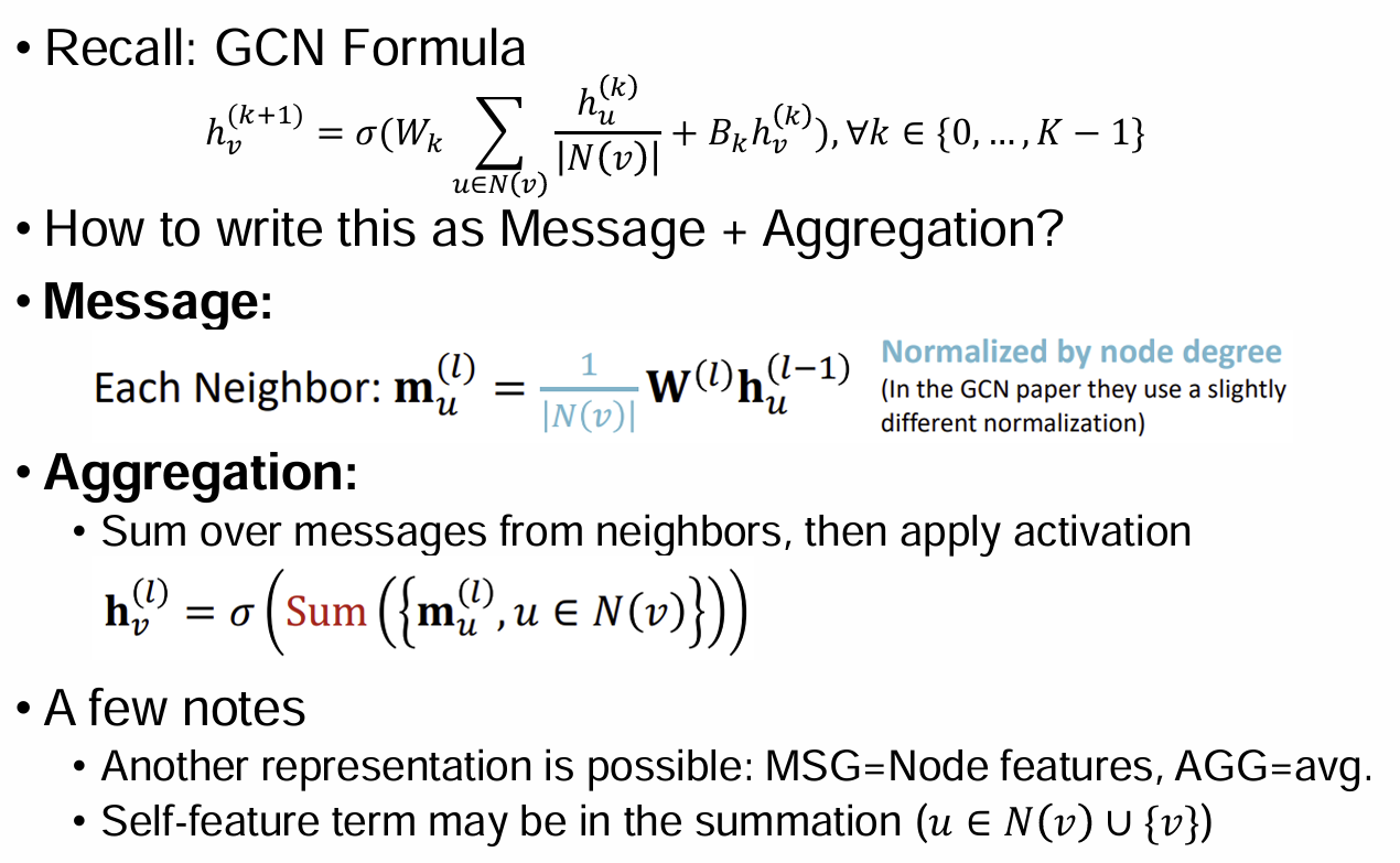few notes: another representation: MSG = Node features, AGG = avg, self-feature temrm may be in the summation (u \in N(v))