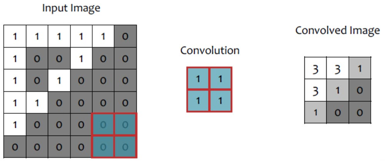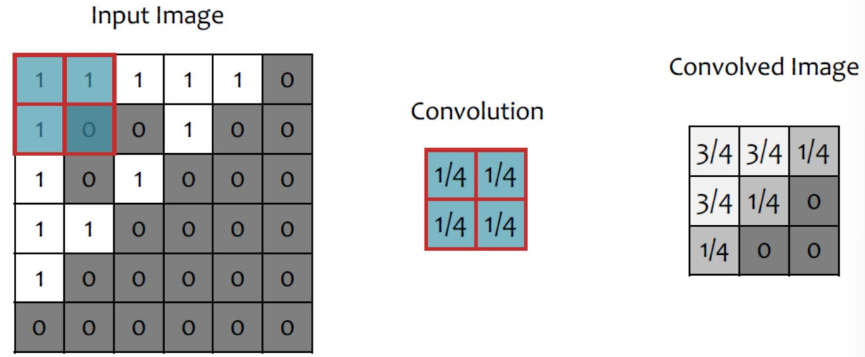 Convolution: pick 3x3 matrix k of weights, slide this over an image, compute inner product(similarity) of k and the corresponding field of the image, and replace the pixel in the center of the field with the output of the inner product operation