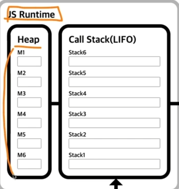 자바스크립트 엔진입장에서는 Heap이라는 영역으로 메모리가 관리가 되고, Call Stack 즉 호출된 함수들의 내역이 쌓이는 곳이다.