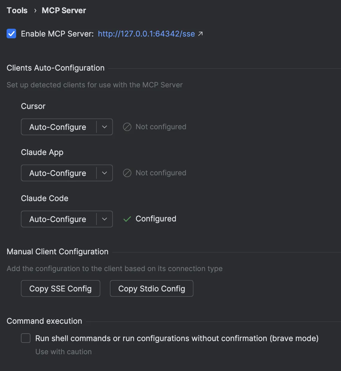 에서 Claude Code를 Auto-Configure할 수 있다. Tools에서 MCP Server가 보이지 않는다면, 2025.2 릴리즈가 반영되지 않는 것일수도 있으니 확인 바란다.
