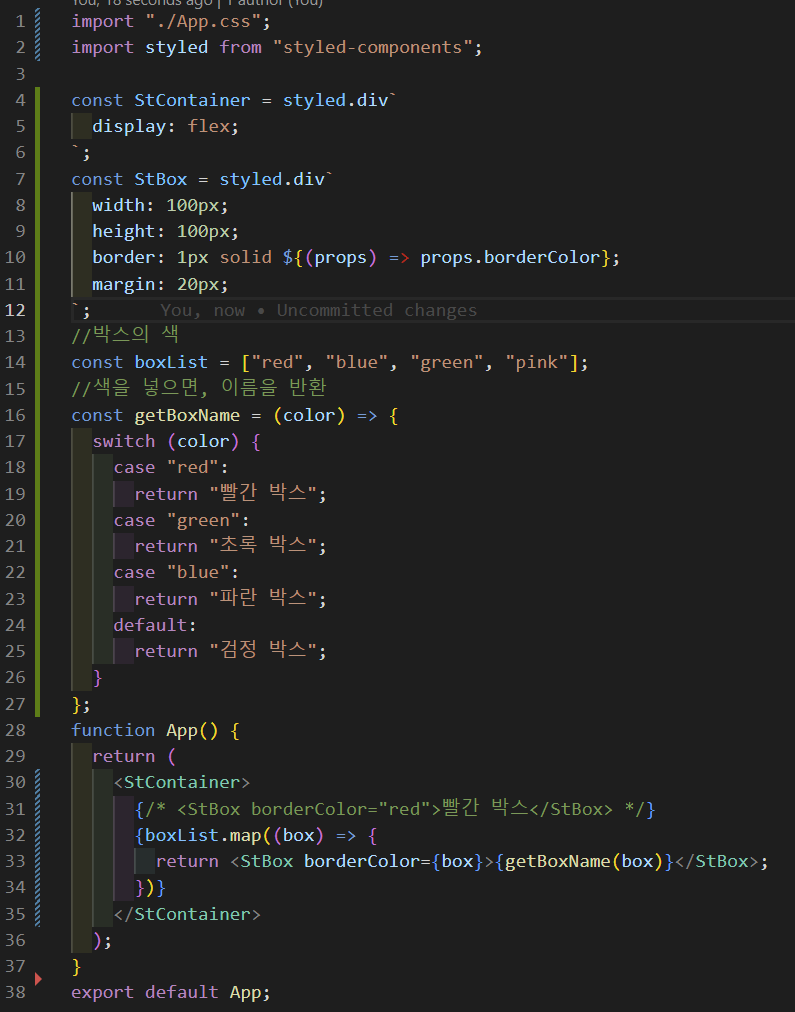 const StBox = styled.div width: 100px; height: 100px; border: 1px solid ${(props) => props.borderColor}; margin: 20px;;