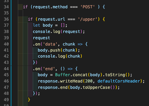 노드에서는 on 메소드가 끝나면 요청에서 데이터가 올때마다 콜백함수를 부르겠다는 뜻이다.