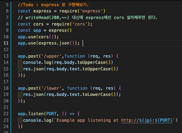 그리고 res.write, res.end 가 쌍으로 같이 다녔던 node.js 와 달리 express , app 에 이미 담겨져 있기 때문에 매번 안써주고 로직만 맞게 작성해주면 된다.
