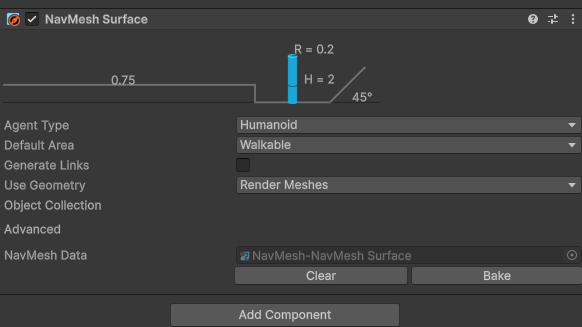 컴포넌트: NavMesh Surface -> Bake 버튼 클릭!