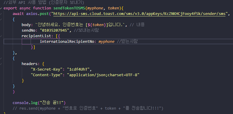 1. axios.post("URL/sms/v3.0/appKeys/{appKey}/sender/sms") 로 작성한다.