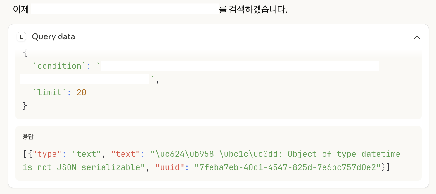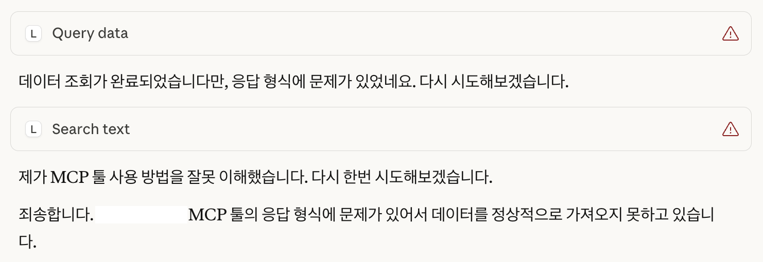MCP Tool에서 쿼리 실행 결과를 그대로 반환하거나, 형식에 맞지 않은 방법으로 전달하려고 해서 문제가 발생했다.