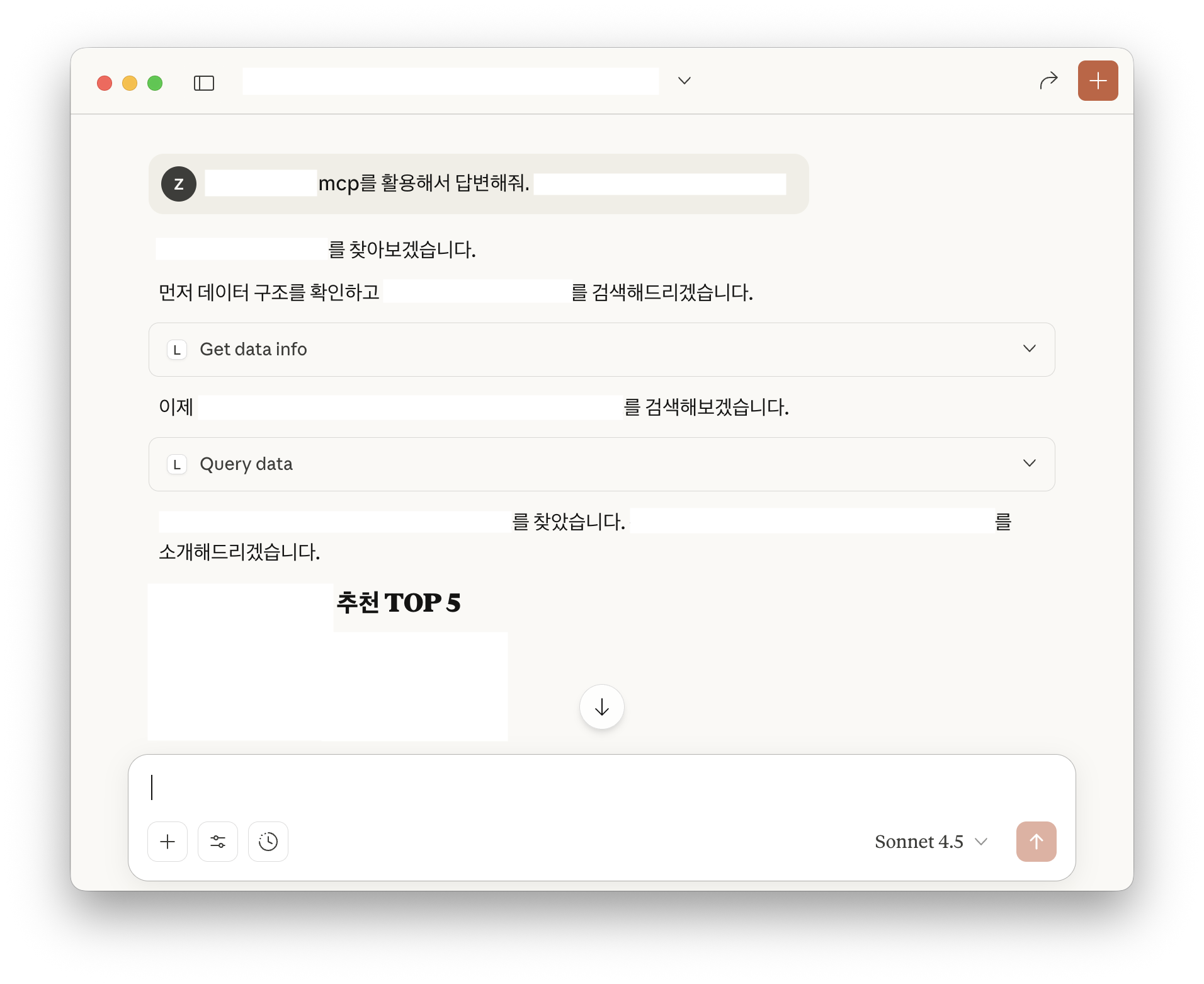 테스트를 하기 전까지는 MCP Tool에는 구체적인 컬럼을 지정한 쿼리를 작성해서 데이터를 검색하고 이를 답변할 수 있도록 작성해야 하는 줄 알고 있었는데, 실제로는 MCP 서버와 LLM이 서로 말이 통하게 만드는 수준의 일을 하면 된다는 점을 직접 경험할 수 있었다. 그리고 이번 테스트 과정에서 다시 한번 깨달은 점은 역시나 서비스를 위해서 데이터가 정말 중요하고, 나는 데이터를 다루는 일을 하고 싶다는 거였다.