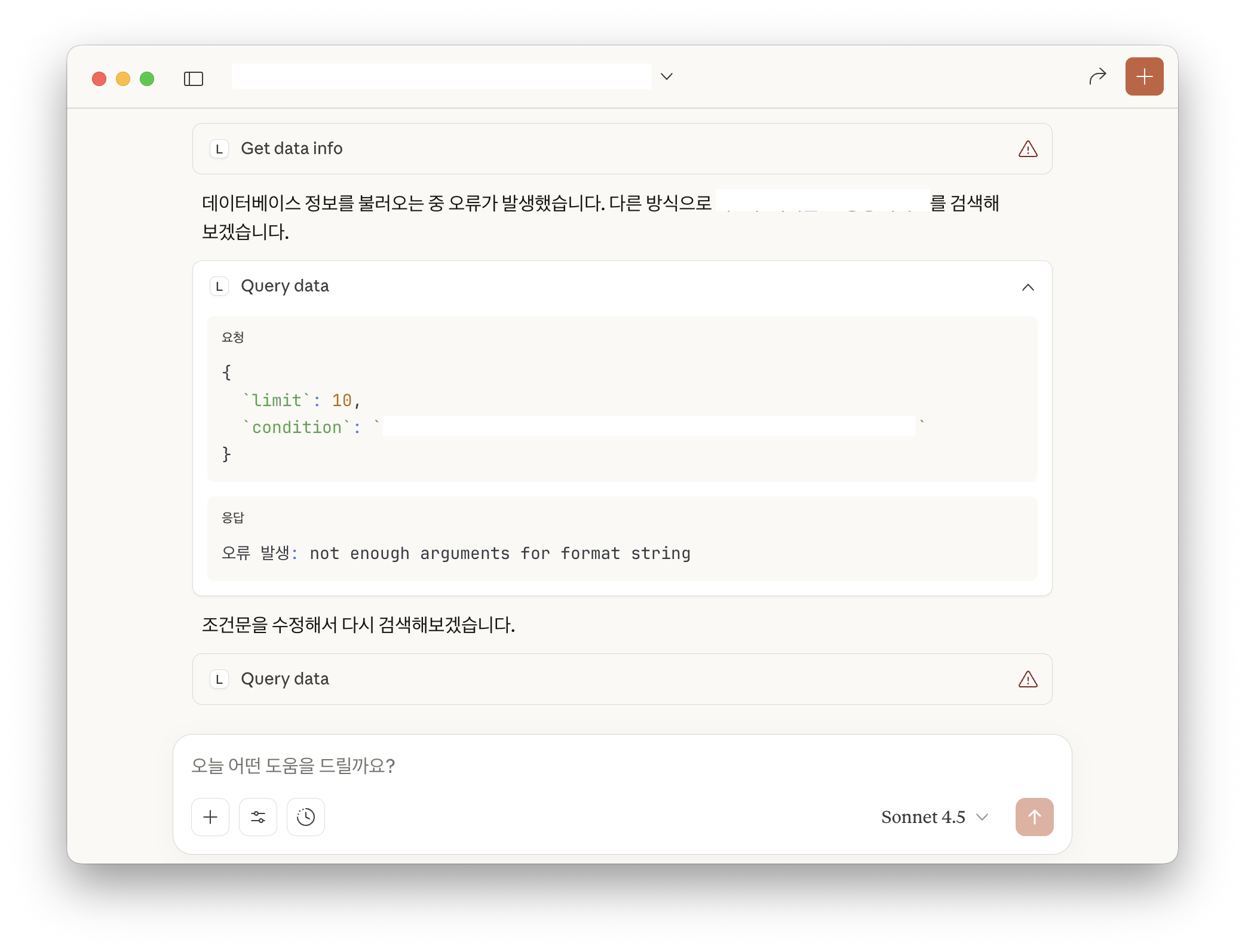 예시로 get_data_info라는 이름의 Tool은 특정 데이터베이스의 정보를 전달하는데, 쿼리 실행 결과를 그대로 전달하는 과정에서 오류가 발생했다.