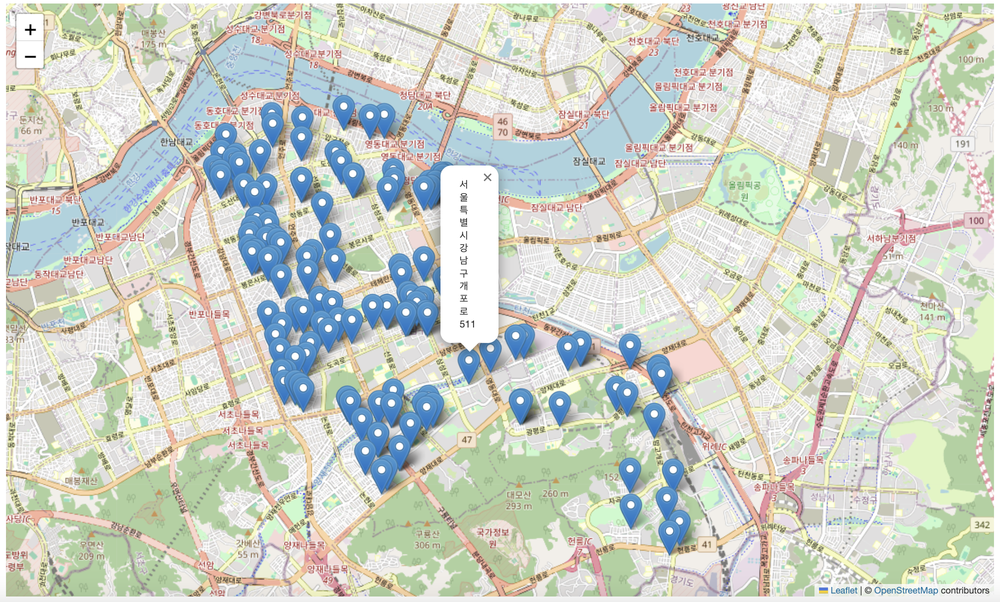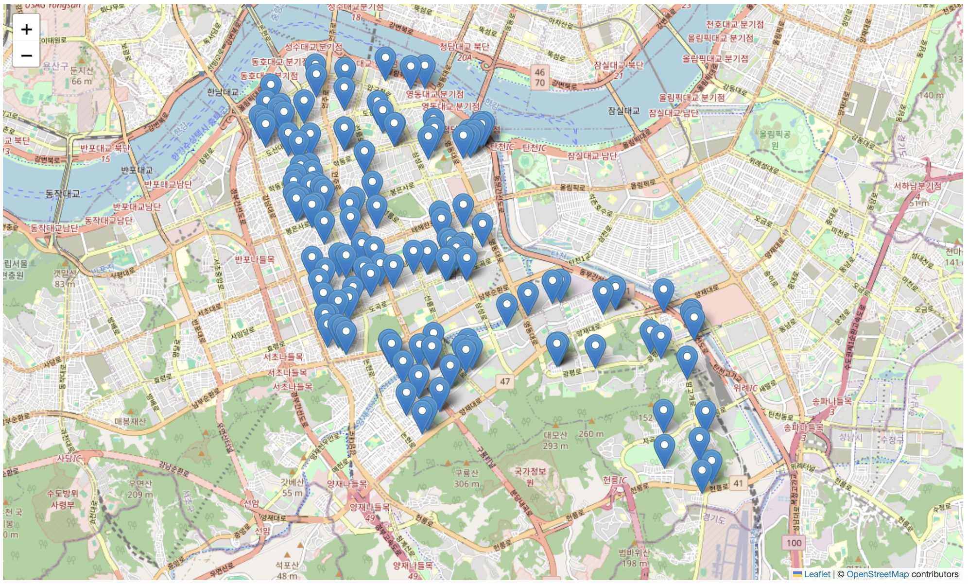 사진은 존재하지 않는 주소를 제외한 강남구의 모든 폐건전지 분리수거함 위치를 지도에 나타낸 결과이다.