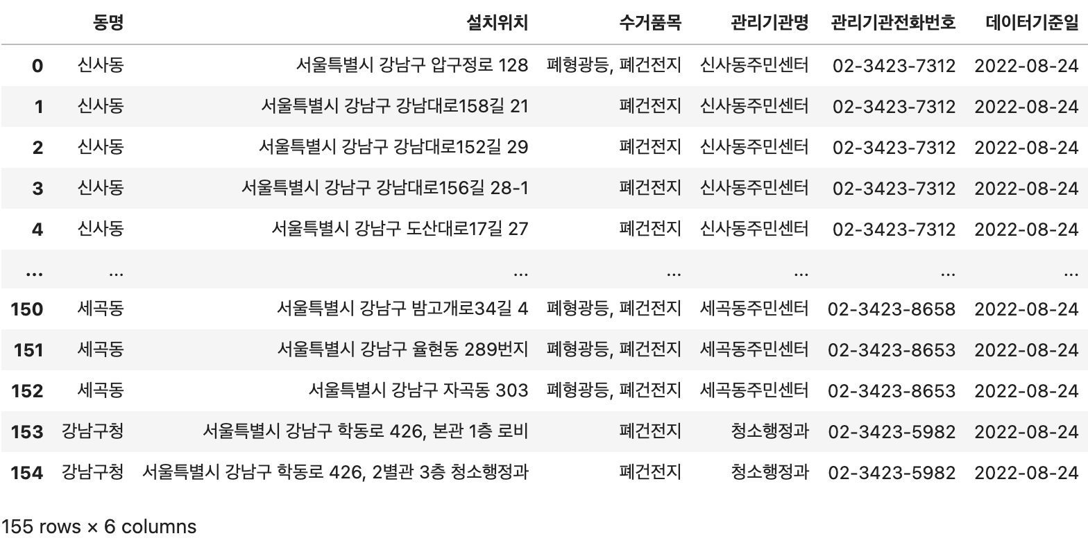 df = pd.read_csv("./서울특별시_강남구_폐형광등 폐건전지 분리수거함 위치.csv", encoding="cp949")