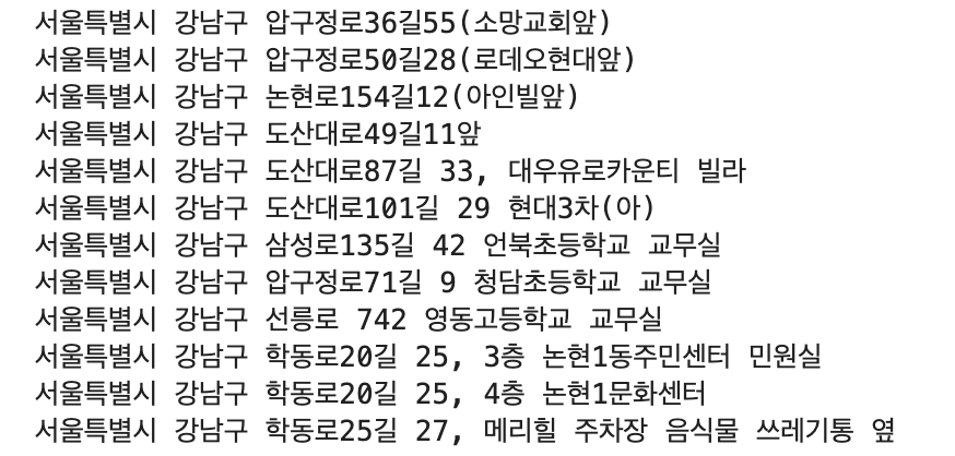주소를 좌표로 변환하는 과정에서 일부 데이터가 None으로 반환되는 것을 알게 되었다. 자세히 알아보니, 설치위치 데이터에 지번 또는 도로명 주소 이외의 정보가 포함되어 있어서 주소 검색 및 좌표 변환에 실패한다는 것을 알 수 있었다.