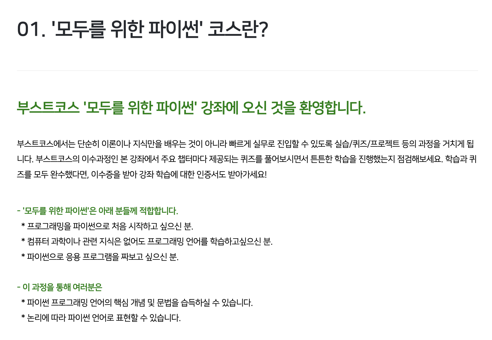 수강 신청을 완료하면 오리엔테이션, 10개의 주제별 강의와 퀴즈로 구성된 강의를 들을 수 있다. 모든 강좌의 퀴즈를 오답 없이 해결하면 모두를 위한 파이썬 코스를 수료할 수 있다.