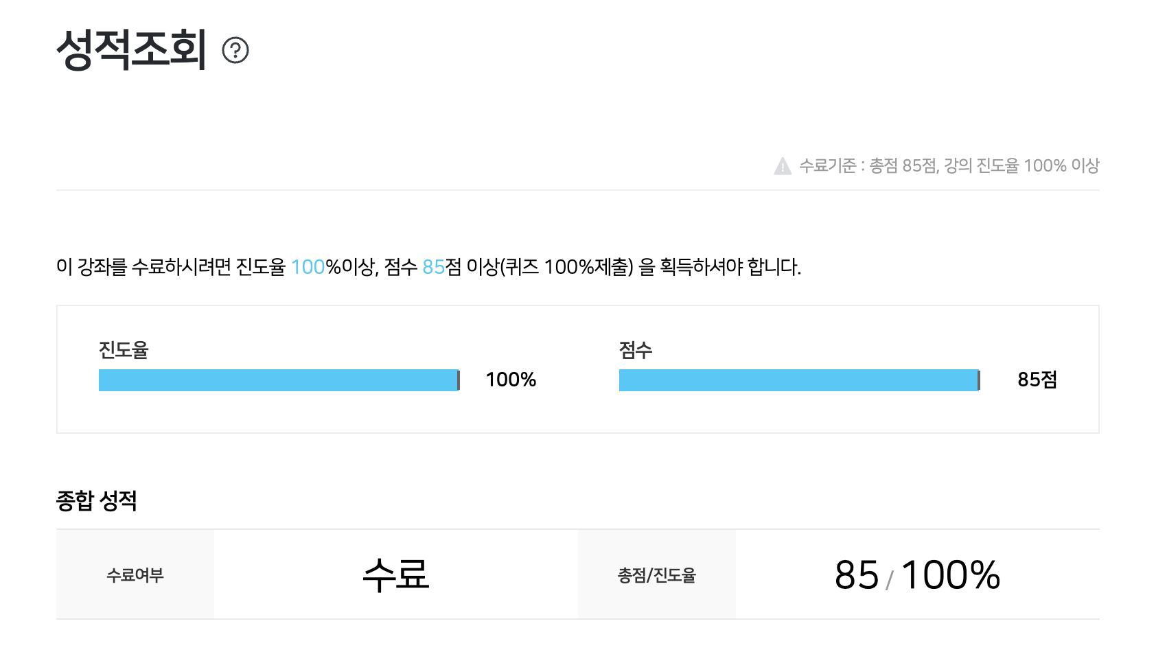 모든 강의를 수강하고, 모든 퀴즈의 정답을 맞히면 수료 조건을 충족하게 된다. 학습하기에 높은 난이도는 아니었지만, 기본기를 다지는 경험을 해서 뿌듯했다.