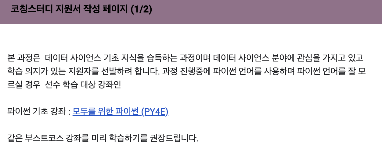 그러던 와중에 부스트코스의 데이터 사이언스 스터디에 대해 알게 되었다. 혼자 공부할 때 주제와 목표 설정에 어려움을 느끼는 편이라, 함께 공부할 수 있는 스터디에 참여하여 구체적인 학습 방향성과 경험을 얻고 싶어서 바로 신청했다.