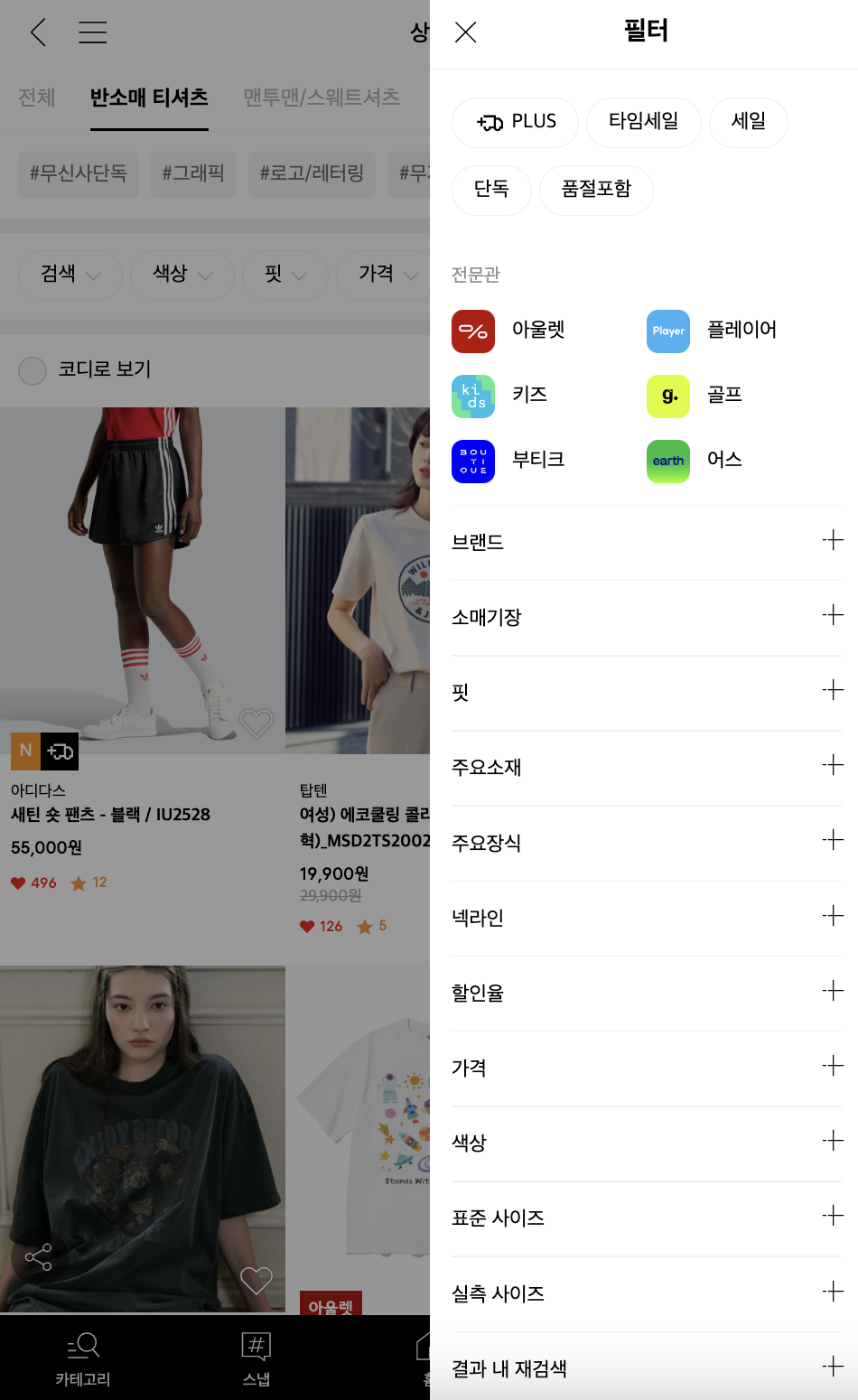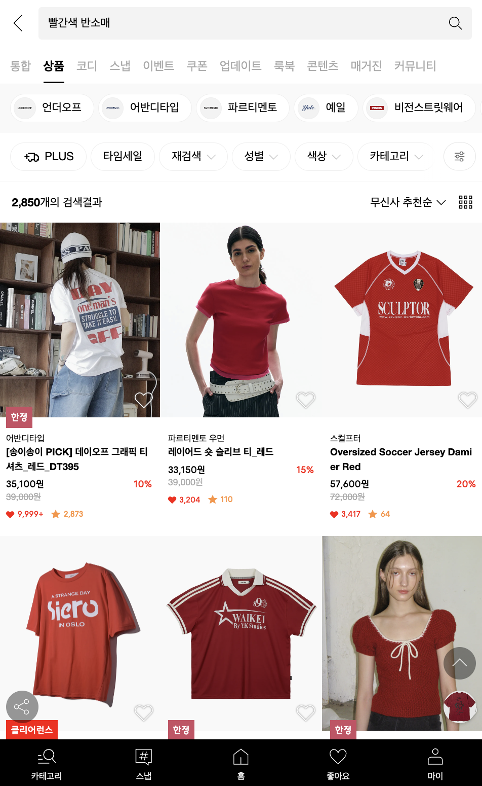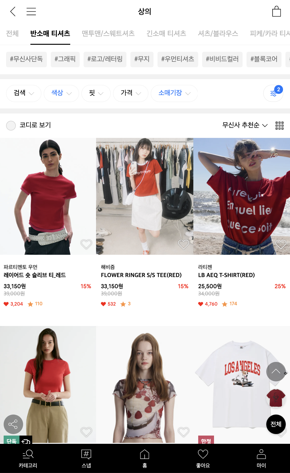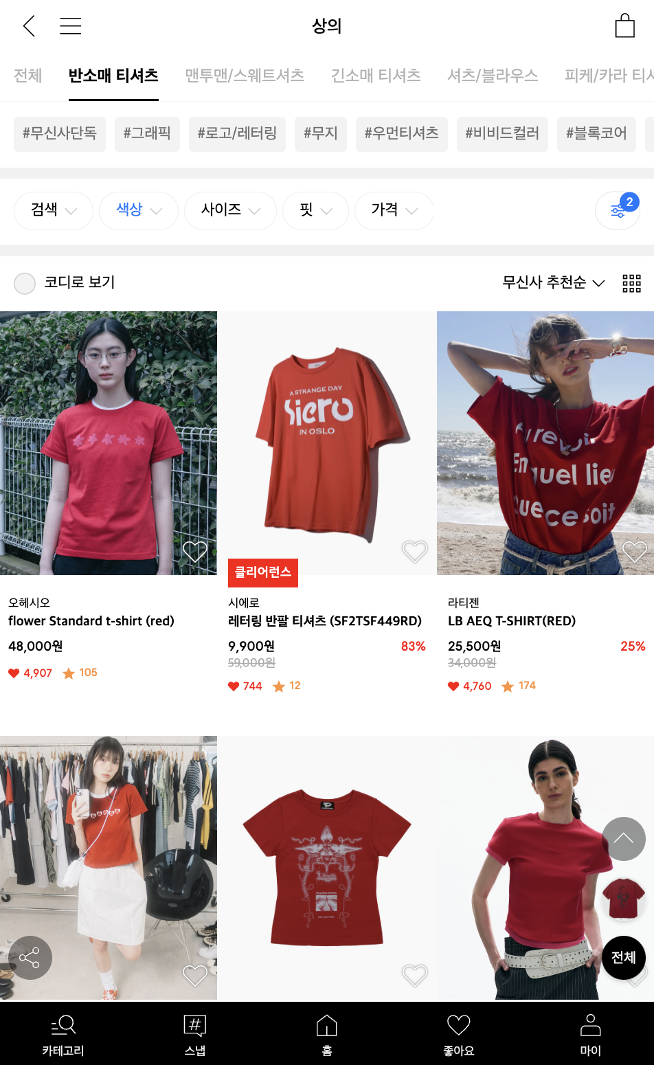 우선순위는 빨간색과 반소매가 오버사이즈보다 높았기 때문에 처음에는 빨간색 반소매로 검색했다.