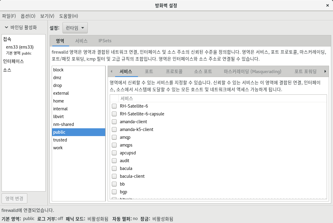 * (GUI) firewall-config (firewall-config 패키지 필요)