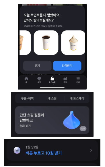 : 이렇게 혹해서 들어가면 …. 머무는 시간에 따라 포인트를 지급하는 이벤트가 있는데 이러면 처음에 토스 앱에 들어왔던 목적은 까먹고 계속 머무르게 된다 .. . … 시선이 가는 위치에 시간이 뜸