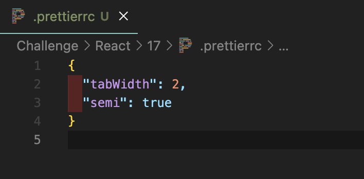 이를 해결하기 위해 .prettierrc라는 설정 파일을 프로젝트 내에 생성하여 해당 파일에 원하는 포맷팅 형식을 저장합니다.